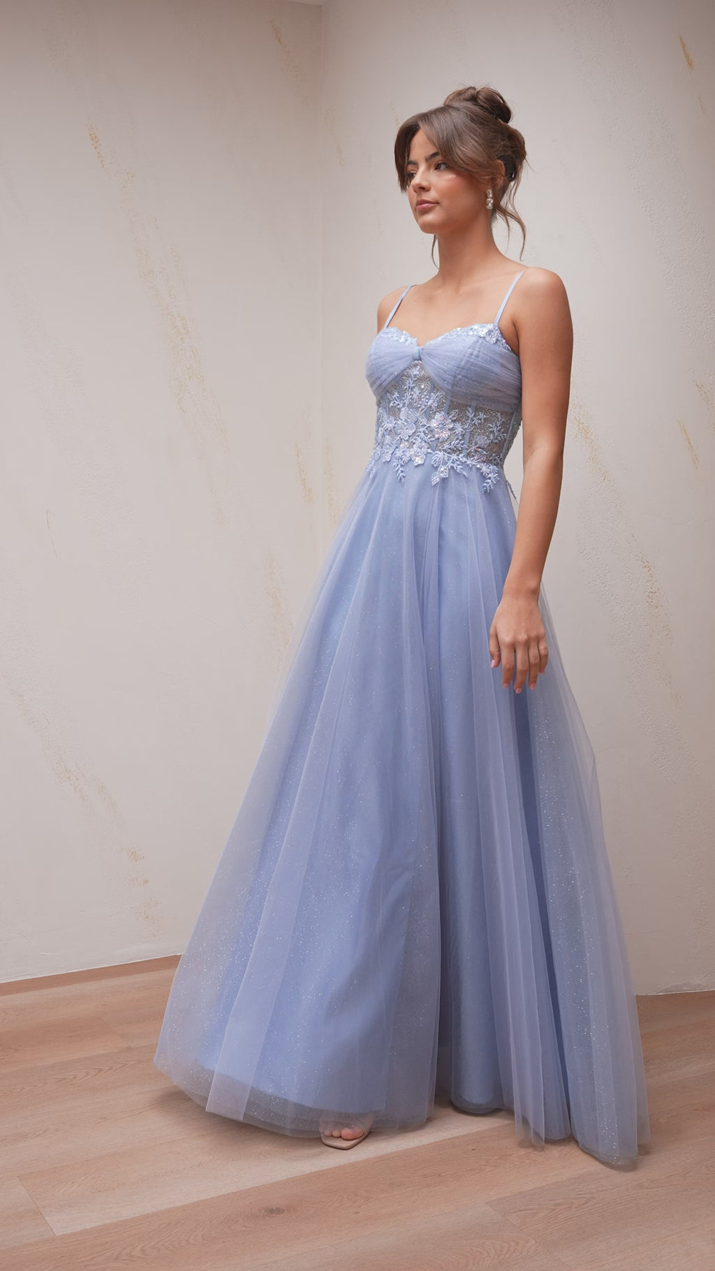 The Celina Formal Dress is an elegant A-line gown featuring a floor-length sparkle tulle skirt that shimmers beautifully with movement. The bodice is adorned with sparkling lace appliqué, which softly trickles into the skirt at the natural waistline, creating a seamless and graceful transition.