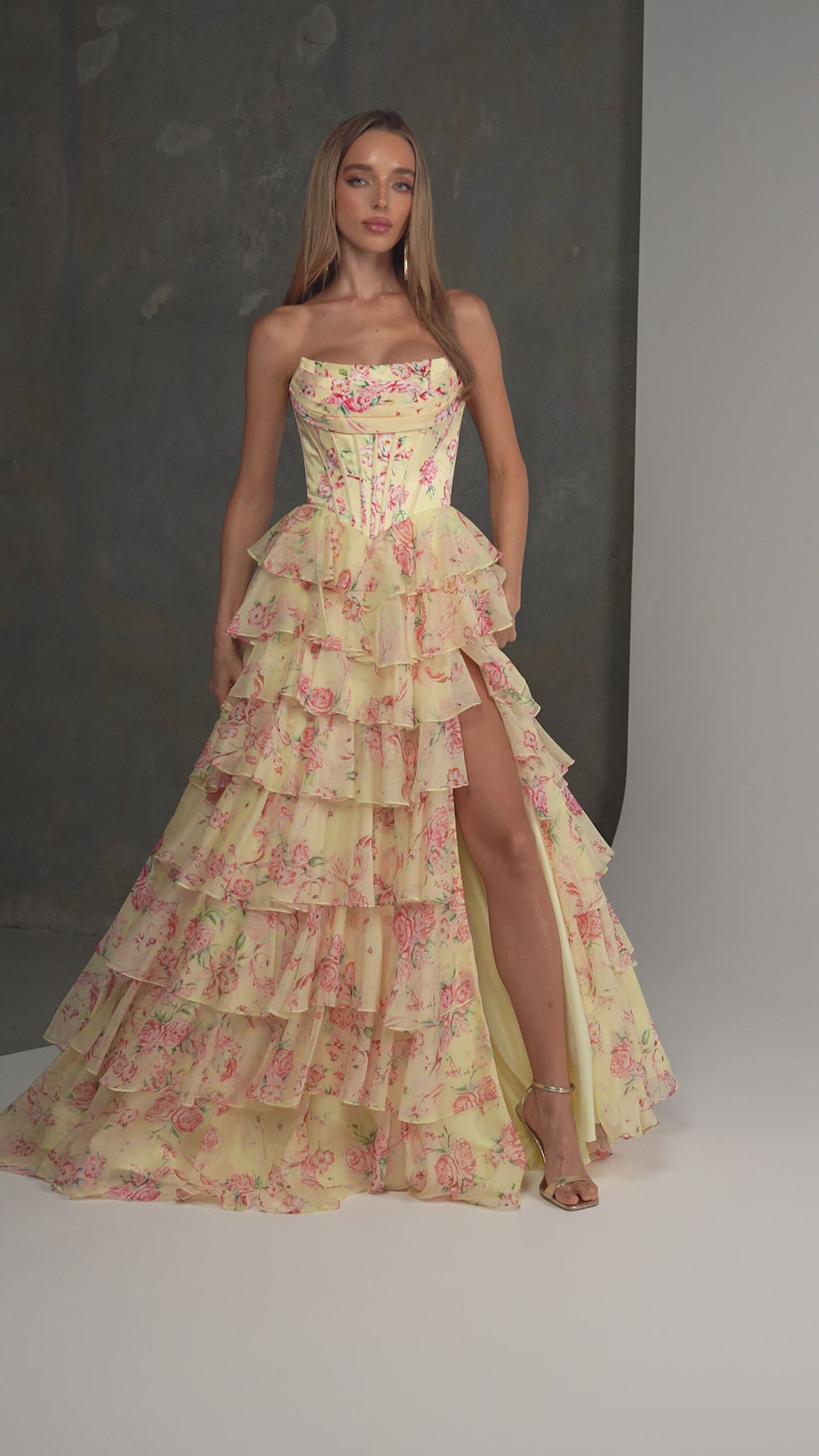 The Dalyce Formal Dress is a strapless floor - length gown designed to embody soft romance with sculpted structure. The voluminous skirt falls into cascading layers of flounce ruffles, creating graceful movement and textural depth with every step.