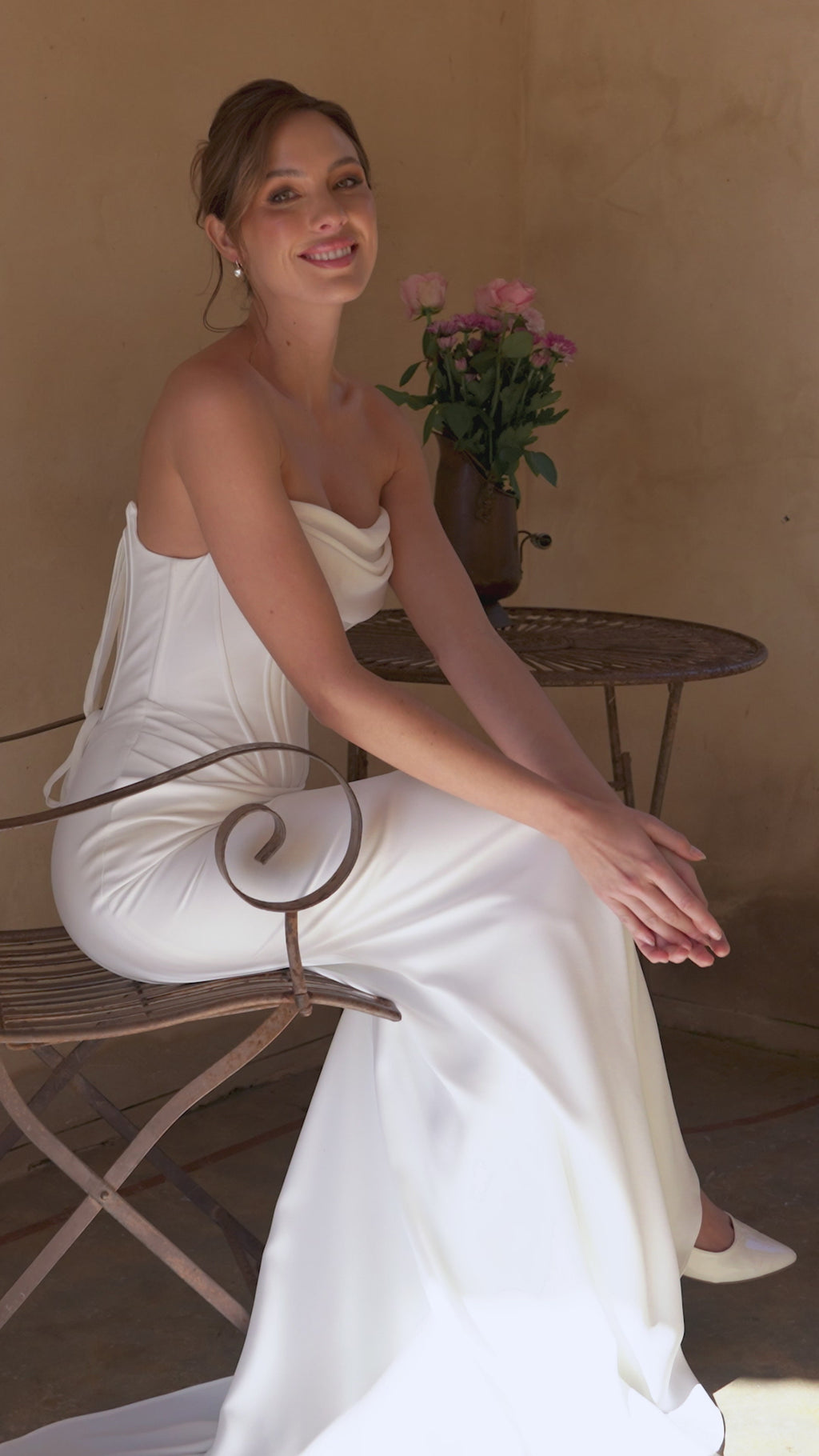 The April wedding dress is a sophisticated fit and flare wedding dress featuring a strapless straight neckline with pleated fabric over the bust. The bodice is shaped with a dramatic basque waistline and a corseted back with modesty panel for structure and support. Crafted from luxurious stretch crepe, the skirt flows into a sweeping cathedral-length train.