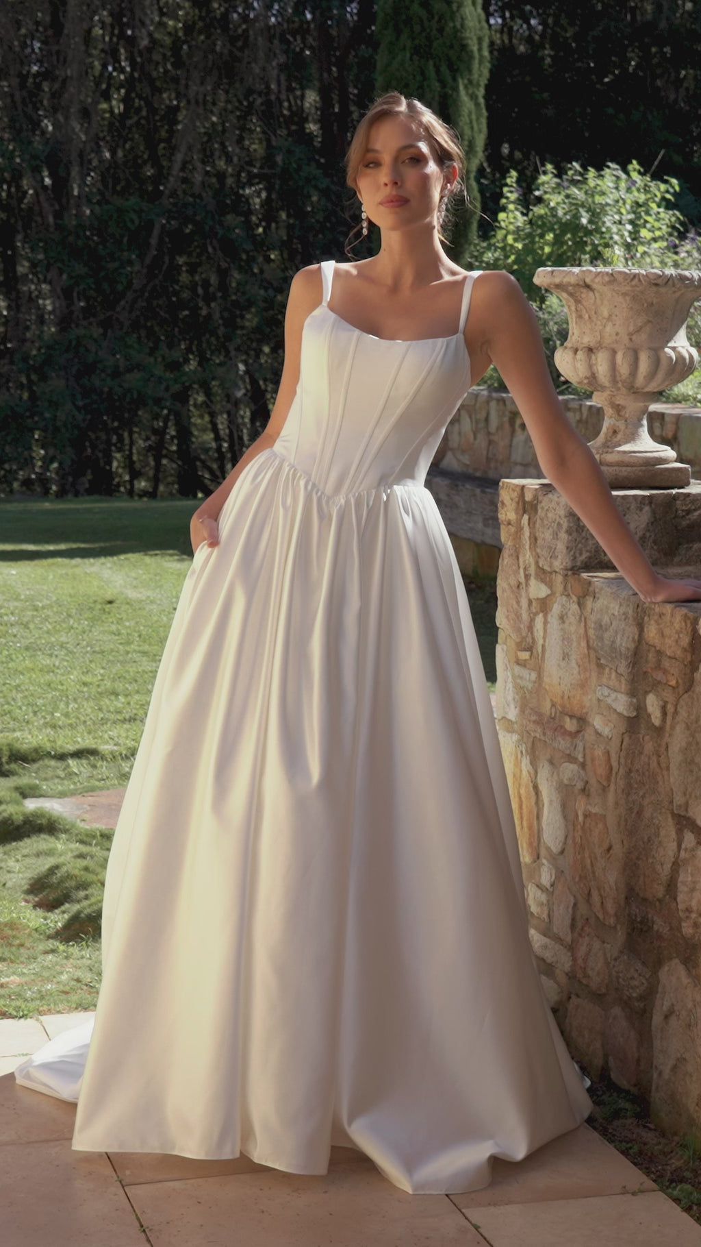 The Arietta wedding dress is a basque-waist A-line gown crafted from luxurious satin. The boned bodice features a soft scoop neckline with delicate straps, leading into a gathered skirt. The back is finished with a loop-and-button closure that extends gracefully into a dramatic cathedral-length train.
