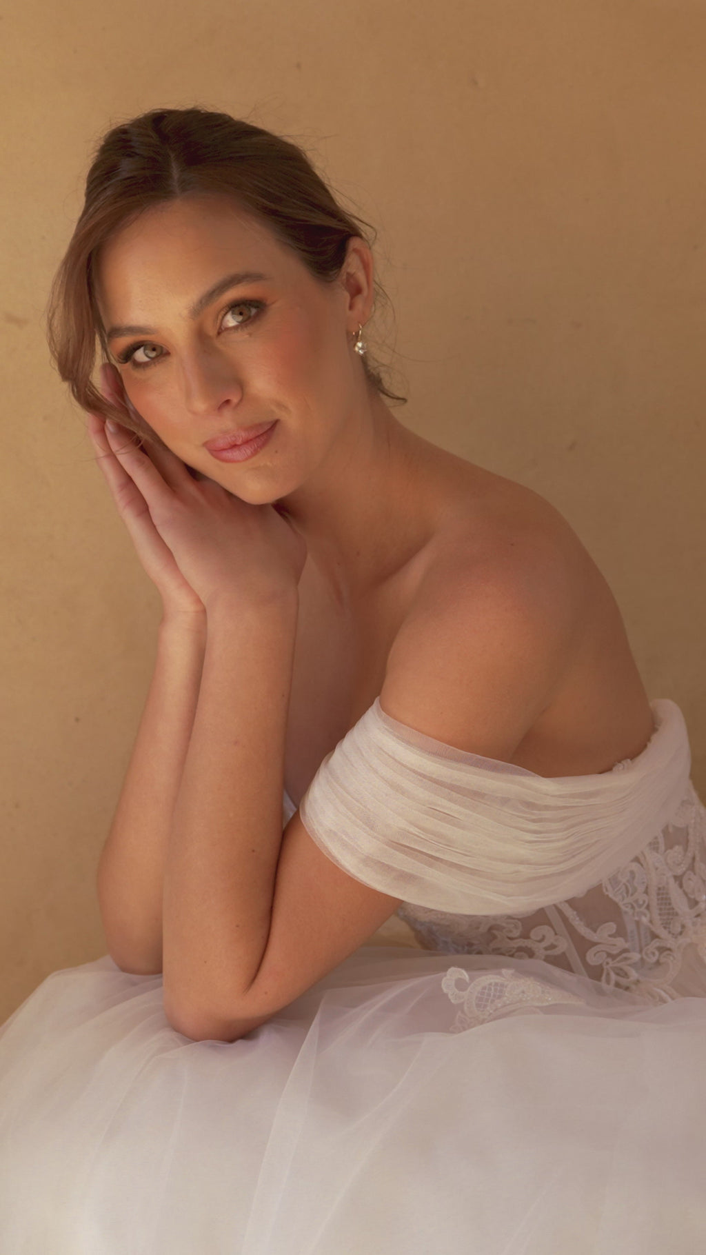 The Aubrey wedding dress is a romantic A-line gown featuring a scooped neckline bodice crafted from illusion lace. Gathered off-the-shoulder straps frame the shoulders, while the lace gently trails into the voluminous gathered skirt. The skirt flows into an illusion cathedral-length train, and the back is finished with an invisible zipper for a seamless look.